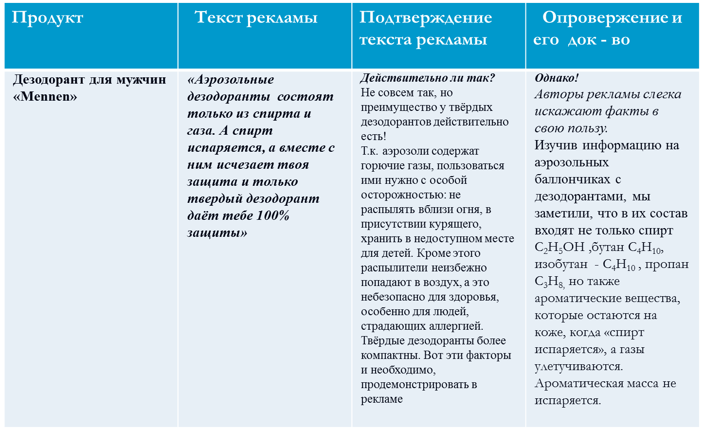 Вывод: рекламщики дезодорантов немного привирают в своей рекламе, говоря о том, что «средство, испаряясь дают стопроцентный результат».