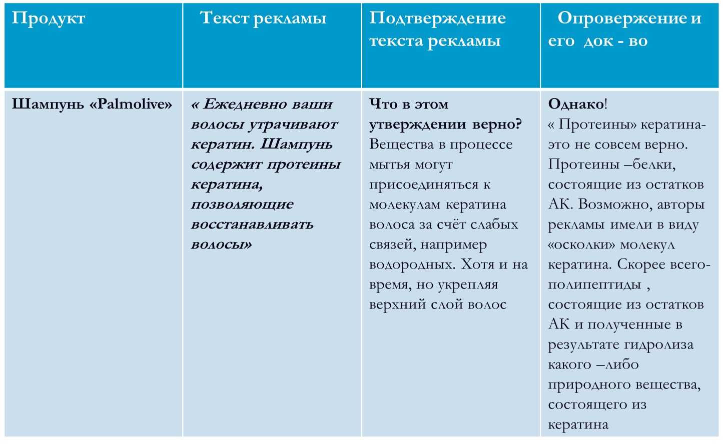 На основе приведенной таблицы можно сделать вывод, что производители шампуня не врут, их шампунь и в самом деле могут восстанавливать волосы, за счет присоединения кератина водородными связями. Но авторы рекламы вводят в заблуждение потребителей, указывая в составе такой пункт, как «протеин кератина», это простой маркетинговый ход, для того чтобы раскрутить товар. На самом деле, укрепляют волосы не «протеины кератина», а «молекулы кератина в водородной связи с волосами».