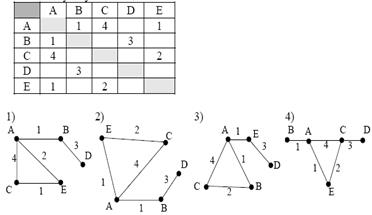 b) В таблице приведена стоимость перевозок между пятью железнодорожными станциями, обозначенными буквами A, B, C, D и E. Укажите схему, соответствующую таблице.