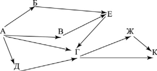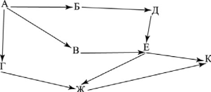 б) На рисунке — схема дорог, связывающих города А, Б, В, Г, Д, Е, Ж, К. По каждой дороге можно двигаться только в одном направлении, указанном стрелкой. Сколько существует различных путей из города А в город К?