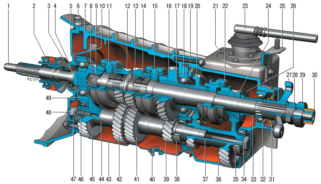 1 – первичный вал; 2 – муфта выключения сцепления; 3 – передняя крышка с направляющей втулкой; 4 – сальник первичного вала; 5 – картер сцепления; 6 – сапун; 7 – картер коробки передач; 8 – шестерня постоянного зацепления первичного вала; 9 – игольчатый подшипник вторичного вала; 10 – лоток для сбора и стока масла; 11 – синхронизатор III и IV передач; 12 – шестерня III передачи; 13 – шестерня II передачи; 14 – вторичный вал; 15 – синхронизатор I и II передач; 16 – шестерня I передачи; 17 – втулка шестерни I передачи; 18 – промежуточный подшипник вторичного вала; 19 – стопорная пластина промежуточного подшипника; 20 – шестерня заднего хода; 21 – гайка крепления механизма выбора передач; 22 – синхронизатор V передачи; 23 – механизм выбора передач; 24 – шестерня V передачи; 25 – кронштейн крепления опорной пластины; 26 – маслоотражательная шайба; 27 – фланец эластичной муфты карданной передачи; 28 – гайка; 29 – уплотнитель центрирующего кольца; 30 – центрирующее кольцо; 31 – сальник вторичного вала; 32 – задний подшипник вторичного вала; 33 – распорная втулка; 34 – болт блока шестерен; 35 – подшипник блока шестерен; 36 – задняя крышка коробки передач; 37 – блок шестерен V передачи и заднего хода; 38 – задний подшипник промежуточного вала; 39 – шестерня I передачи промежуточного вала; 40 – пробка сливного отверстия; 41 – шестерня II передачи промежуточного вала; 42 – шестерня III передачи промежуточного вала; 43 – нижняя крышка коробки передач; 44 – промежуточный вал; 45 – шестерня постоянного зацепления промежуточного вала; 46 – передний подшипник промежуточного вала; 47 – зажимная шайба подшипника промежуточного вала; 48 – болт зажимной шайбы; 49 – задний подшипник первичного вала