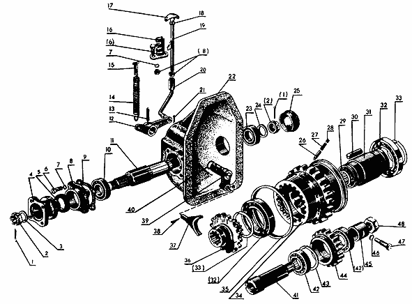 1.Шплинт 4х25.019 ГОСТ 397-79; 2.Гайка; 3.Шайба; 4.Фланец; 5.Манжета 2.2.38х58-1 ГОСТ 8752-79; 6.Болт М8-6gх25.88.35.019 ГОСТ 7796-70; 7.Шайба 8Т ОСТ 37.001.115-75; 8.Корпус; 9.Прокладка; 10.Подшипник 306К5 ГОСТ 8338-75; 11.Вал; 12.Рычаг; 13.Штифт 10х40 ГОСТ 14229-78; 14.Пружина;15.Петля; 16.Стойка; 17.Рукоятка; 18.Гайка М8-6Н.6.019 ГОСТ 5915-70; 19.Тяга; 20.Тяга; 21.Шплинт 3,2х18.019 ГОСТ 397-79; 22.Корпус; 23.Подшипник 305А ГОСТ 8338-75; 24.Шайба; 25.Крышка; 26.Штифт; 27.Пружина; 28.Пробка; 29.Шайба; 30.Ролик; 31.Втулка 32.Подшипник 115 ГОСТ 8338-75; 33.Кольцо;34.Шестерня; 35.Обойма; 36.Шестерня; 37.Вилка; 38.Шплинт 4х22 ГОСТ 397-79; 39.Валик с рычагом; 40.Кольцо 020-025-30-1-4; 41.Ось; 42.Подшипник 7306А ГОСТ 333-79; 43.Кольцо; 44.Шестерня; 45.Втулка;
