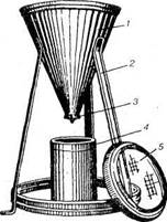 Определение выполняют на приборе (рис. 4.2), который состоит из воронки 1, металлического мерного цилиндра 4. Воронка представляет собой усеченный конус, переходящий внизу в трубку, которая перекрыта задвижкой 3. Внутри воронки помещается сито 5, предохраняющее от попадания крупных включений в трубку при засыпке цемента. Воронка опирается на подставку 2.