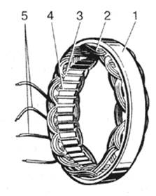 1 - сердечник, 2 - обмотка, 3 - пазовый клин, 4 - паз, 5 - вывод для соединения с выпрямителем