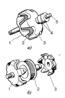 а - в сборе; б - полюсная система в разобранном виде; 1,3- полюсные половины; 2 - обмотка возбуждения; 4 - контактные кольца; 5 - вал