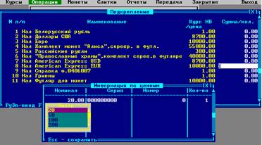 4.1. Установите курсы КБ по ценным за рубли и валюту. Для этого выберите пункт меню < Курсы – Ввод курсов КБ по ценным за рубли > и введите курсы покупки и продажи ценных бланков за белорусские рубли. Аналогично ввести кусы за валюту, выбрав пункт меню < Курсы – Ввод курсов КБ по ценным за валюту >.