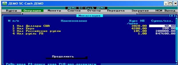 4.7. В конце смены необходимо сделать инкассацию средств по кассе. В окне «Демо SC-Cash Демо» выполните пункт меню < Операции – Инкассация >, выберите операцию «Инкассация» и введите необходимую сумму/ количество денежных средств и ценных бумаг.Для автоматического отображения остатка средств нажмите комбинацию клавиш <Shift+F5>. Щелкните по кнопке < Продолжить >, нажмите клавишу < Enter >. Для подтверждения внутренней операции щелкните по кнопке < Провести > в соответствующей форме.Просмотрите полученный отчет по операции.
