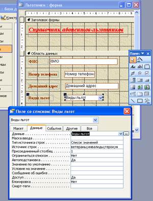 · вызовите для поля Виды льгот контекстное меню и выберите в нем пункт Свойства, а в появившемся окне Поле со списком: Виды льгот перейдите на вкладку Данные,