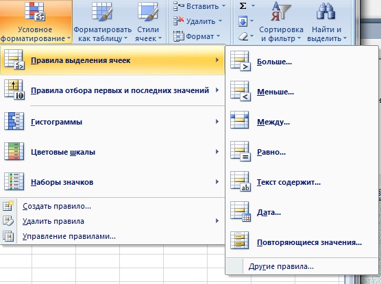 - Щелкните по кнопке Условное форматирование группы Стили вкладки Главная, в галерее выберите команду Правила выделения ячеек, а затем в подчиненном меню выберите условие (рис. 3.3).