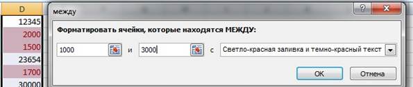 - Настройте параметры условия и выберите способ выделения, например, выделить ячейки с содержимым между 1000 и 3000: