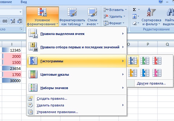 - Щелкните по кнопке Условное форматирование группы Стили вкладки Главная, в галерее выберите команду Гистограммы, а затем в подчиненном окне выберите цветовое оформление
