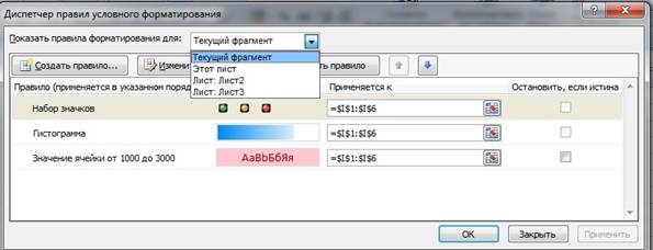 - В окне Диспетчер правил условного форматирования в поле списка Показать правила форматирования для выберите лист, для которого производится изменение правил.