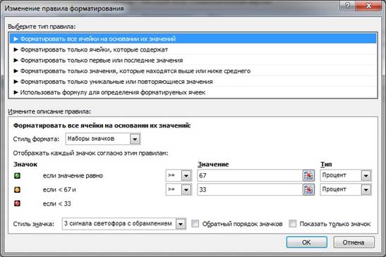 - В окне Изменение правила форматирования можно выбрать другой тип правила, изменить условие и параметры форматирования.