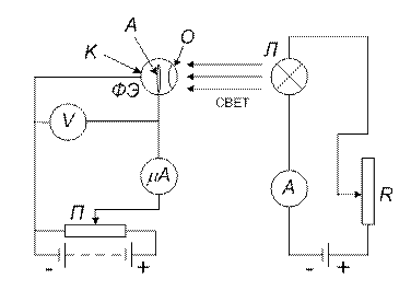 оптической скамьи фотоэлемента. От лампы накаливания свет попадает в окошко фотоэлемента (О) и в цепи фотоэлемента начинает протекать фототок. Величина фототока измеряется микроамперметром (