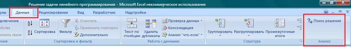 Рис. 2. Надстройка Поиск решения установлена; вкладка «Данные», группа «Анализ»