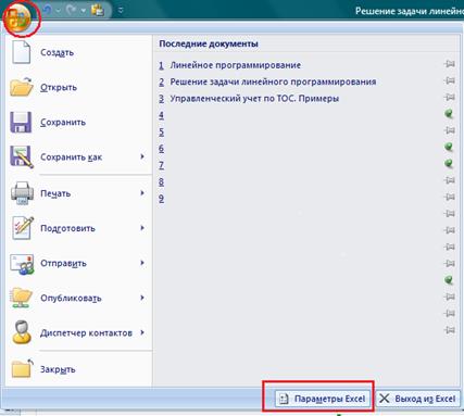 Если надстройки «Поиск решения» вы на ленте Excel не обнаружили, щелкните на кнопку Microsoft Office, а затем Параметры Excel (рис. 3).