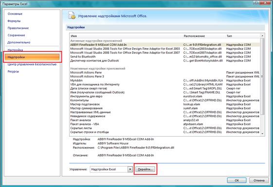Выберите строку Надстройки, а затем в самом низу окна «Управление надстройками Microsoft Excel» выберите «Перейти» (рис. 4).