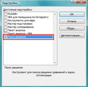 В окне «Надстройки» установите флажок «Поиск решения» и нажмите Ok (рис. 5). (Если «Поиск решения» отсутствует в списке поля «Надстройки», чтобы найти надстройку, нажмите кнопку Обзор. В случае появления сообщения о том, что надстройка для поиска решения не установлена на компьютере, нажмите кнопку Да, чтобы установить ее.)