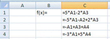 Пусть значения x1, x2, x3, x4 хранятся в ячейках A1:A4, a значение функции L - в ячейке С1 = =5*A1-2*A3.