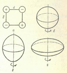 Одной из основных характеристик атомного ядра является электрический заряд – т.е. интегральная характеристика электрических свойств. Однако, с распределением нуклонов в ядре заряд не связан. Дипольный момент может быть, когда центр тяжести системы не совпадает с центром заряда: P=Zeδ, где δ – это расстояние между центром заряда и центром массы. Опыт показывает, что в стационарном состоянии дипольный момент равен нулю, т.е. центры не сдвинуты и наблюдается симметрия относительно зеркального отражения, т.е. протон и нейтрон равномерно распределены в ядре. Но оказалось что у некоторых ядер нарушается сферическая симметрия распределения зарядов, что означает наличие у ядер более высокой степени электрического момента, который называется квадрупольный электрический момент. Если представить себе что ядро представляет собой эллипсоид вращения, то величина квадрупольного электрического момента является мерой отклонения распределения зарядов ядер, а следовательно и форма ядра от сферической.