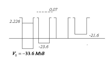 может существовать, только если глубина ее 33,6 МэВ. Для уровня 0,07 достаточна глубина 23,6 МэВ. Если глубина меньше чем