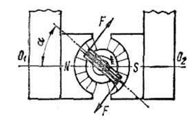 Принцип работы приборов магнитоэлектрической системы основан на взаимодействии магнитного поля тока, проходящего по обмотке рамки, с магнитным полем постоянного магнита (рис. 1). Когда по рамке идет ток, она поворачивается на угол α, пропорциональный измеряемому току (напряжению):