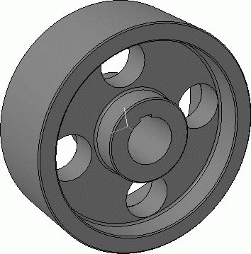 5. Завершите создание эскиза и выполните команду Вырезать выдавливанием, установив направление выдавливания – Два направления, и величину выдавливания – Через все для обоих направлений. Обратите внимание: такое же удаление материала можно было выполнить с помощью двух операций вырезания: сначала отверстий на толщину диска, а потом паза – на ширину ступицы. Однако более рациональным является приведенное здесь решение, когда профили всех вырезов собраны в одном эскизе, а вырезание осуществляется насквозь через всю модель (в оба направления от плоскости эскиза). Полученная модель показана на рис. 3.56.