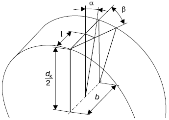 Первый вариант – выполнение выреза по сечениям. При этом в модели колеса строятся эскизы-сечения, плоскости которых удалены от боковой поверхности колеса на величину l = i · b / (n с – 1), где i – порядковый номер эскиза, b – ширина колеса, n с – количество сечений или эскизов. Первый эскиз лежит на торцевой плоскости зубчатого венца, последний – на противоположной торцевой плоскости, остальные равномерно размещены между ними. Каждая плоскость (сечение) содержит эскиз профиля выреза между зубьями, повернутый на угол α относительно изображения предыдущего эскиза. Этот угол определяется соотношением α = l · tg β / dк, где β – угол наклона линии зуба, d к – делительный диаметр зубчатого колеса (рис. 3.57).
