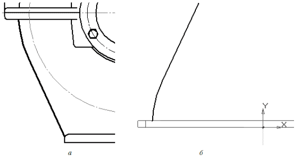 Рис. 3.73. Изгиб передней стенки редуктора: кривая на чертеже (а) и ее размещение в эскизе (б)
