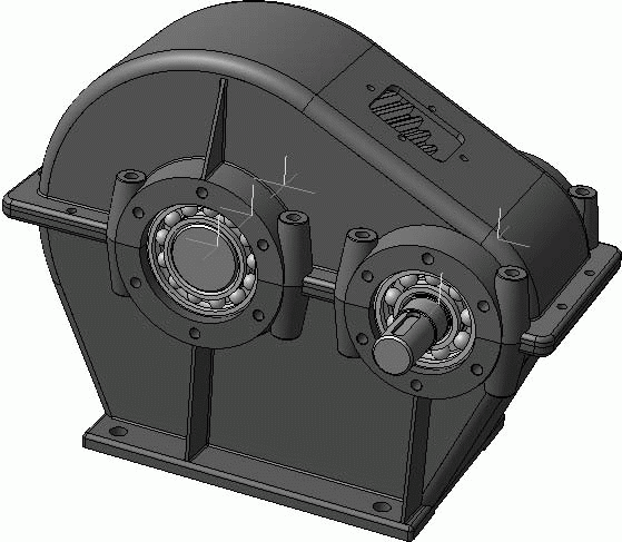 11. В реальном производстве после запрессовки подшипников на вал весь комплекс (зубчатое зацепление) вставляется и фиксируется в корпусе редуктора. Поступим и мы таким же образом и добавим в сборку корпус. Для этого вставьте модель корпуса из файла в точку начала координат и зафиксируйте его (не забывайте давать понятные имена компонентам в дереве сборки). Подшипниковые узлы установятся точно в отведенные им места в корпусе редуктора (рис. 3.116).