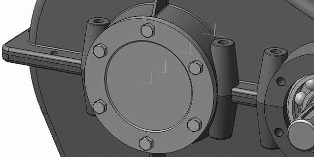 Вставьте крышку из файла Крышка подшипника глухая 2.m3d и создайте сопряжение Соосность между отверстием под крышку (в корпусе или крышке редуктора – не имеет особого значения) и какой-либо цилиндрической поверхностью на самой крышке (рис. 3.118). Добавьте сопряжение Совпадение объектов, чтобы фланец крышки лег точно на поверхность мест крепления крышки. Проследите, чтобы отверстия под фиксирующие винты в крышке подшипника совпали с отверстиями на корпусе и крышке редуктора.