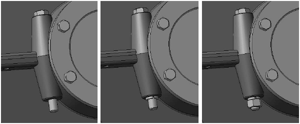 Раскройте в Менеджере библиотек библиотеку крепежа, перейдите в папку БОЛТЫ и выберите строку Болты с шестигранной головкой. Настройте параметры добавляемого в сборку библиотечного элемента следующим образом: диаметр – 14 мм, длина – 160 мм (длина болта определяется с учетом того, что суммарная длина обеих бобышек составляет 140 мм). Используя автосопряжения при вставке компонента из библиотеки, установите болт в отверстие одной из бобышек крышки редуктора (рис. 3.121, а). Перейдите в библиотеке крепежа в папку ШАЙБЫ и выберите строку Шайбы пружинные. Появится окно настройки параметров трехмерных моделей пружинных шайб. Из раскрывающегося списка Тип выберите пункт Нормальные, а из списка Диаметр стержня – значение 14. Запустите процесс построения и вставки шайбы в сборку, нажав кнопку OK. С помощью автоматического наложения сопряжений сразу поместите фантом шайбы на вставленный в бобышку болт, а затем совместите торцевую поверхность шайбы с нижней опорной поверхностью бобышки корпуса (рис. 3.121, б). Аналогично добавьте в сборку гайку, тем самым завершив формирование крепежного элемента. Для этого в библиотеке крепежа перейдите в папку ГАЙКИ и выберите строку Гайки шестигранные. В появившемся окне из раскрывающегося списка Тип выберите пункт Нормальные, а также задайте диаметр гайки равным 14 мм. Все остальные настройки можете не изменять. Нажмите кнопку ОK и совместите отверстие фантома гайки со стержнем болта, а ее торцевую поверхность – с нижней торцевой поверхностью шайбы. Зафиксируйте компонент, нажав кнопку Создать объект. Получится готовое болтовое соединение бобышек корпуса и крышки редуктора (рис. 3.121, в).