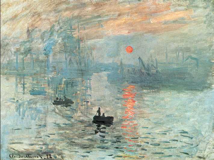 «Впечатление. Восходящее солнца» - фиерия желтого, оранжевого, зеленого цвета. Лодка – зрительный акцент. Неуловимый, незаконченный пейзаж, нет контуров. Изменчивость световоздушной среды. Лучи света изменяют видение.