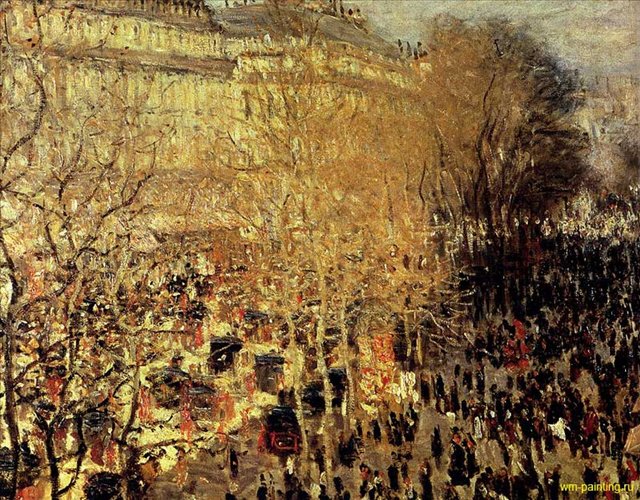 «Бульвар Капуцинок в Париже» - фрагментальная. Срезает двух человек, которые смотрят на бульвар с балкона. Толпа людей – жизнь города. Половина в свете от заходящего солнца, а половина в тени от здания. Нет зрительного центра, мгновенное впечатление.