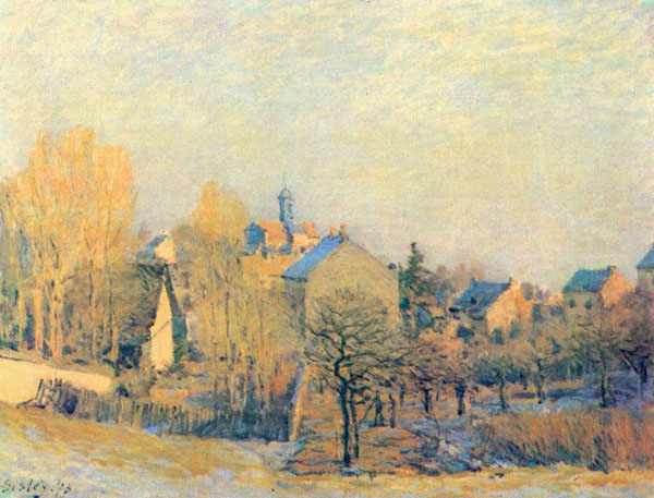 «Мороз в Лувесьенне» - утро, свежее состояниепредметы купаются в свете (слияние). Нет теней (тончайшие нюансы), желто-оранжевые цвета. Спокойный уголок, а не торопливый город. Ощущение чистоты, хрупкости, любви к этому местечку