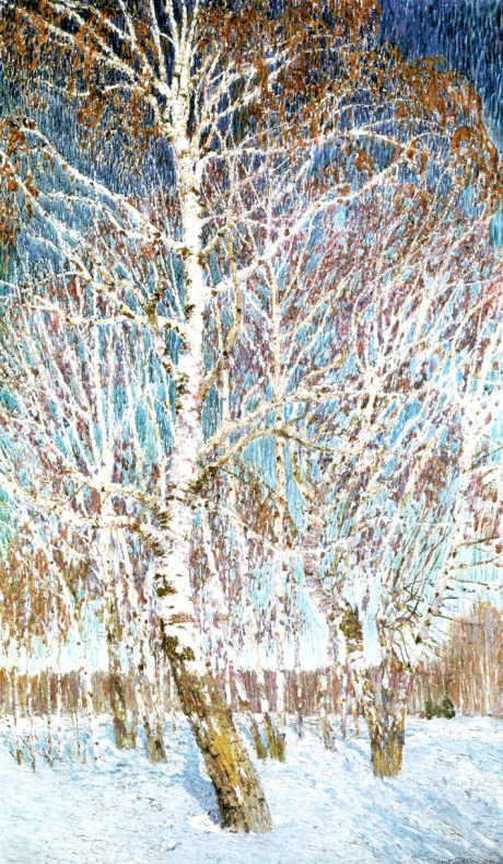«Февральская лазурь» - увидел березу с уровня земли и был потрясен. Перезвоны радуги объединены лазурью неба. Береза монументальна (во все полотно).