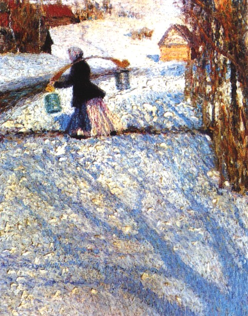 «Мартовский снег» - девушка несет ведра на коромысле, тень от дерева на подтаявшем снегу.