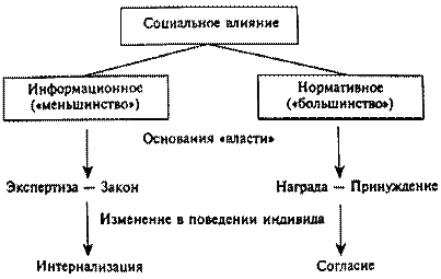 Дальнейшие исследования феномена конформности привели к выводу о том, что давление на индивида может оказывать не только большинство группы, но и меньшинство. Соответственно М.Дойчем и Г.Джерардом были выделены два вида группового влияния: нормативное (когда давление оказывает большинство, и его мнение воспринимается членом группы как норма) и информационное (когда давление оказывает меньшинство, и член группы рассматривает его мнение лишь как информацию, на основе которой он должен сам осуществить свой выбор) (рис. 12).Таким образом, проблема влияния большинства и меньшинства, проанализированная С.Московичи, имеет большое значение и в контексте малой группы.
