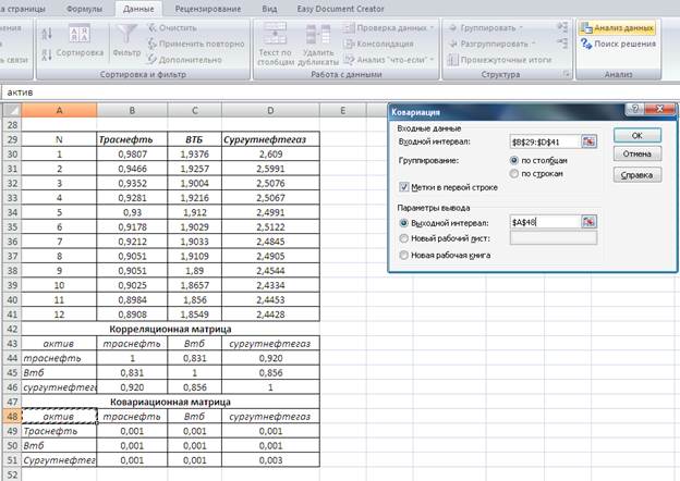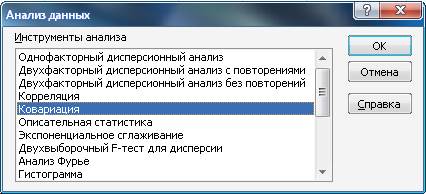 Рассчитаем ковариацию. В среде MS Excel на панели инструментов выберем: данные— анализ данных ―ковариация― ОК