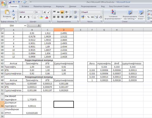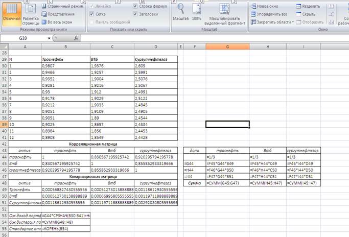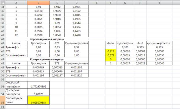 Нажмем кнопку выполнить. Как видим из рис. 7. уменьшилось стандартное отклонение, и изменились доли. Наибольший процент в портфеле составят акции ВТБ - 87% и 13 % акции Транснефти.