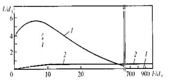В качестве кумулятивной облицовки (КО) в разрывном заряде ВВ боевого элемента типа SADARM применяются низкие конические (угол раствора конуса 150... 160°) или сегментные (высота прогиба основания облицовки h0 = (0,1...0,3)d3, где d3 диаметр заряда) облицовки. Кумулятивные заряды с такими облицовками при взрыве формируют невысокоградиентную растягивающуюся кумулятивную струю (КС), а безградиентный ПЭ (ударное ядро) со скоростью Vпэ = 2,0...2,5 км/с и с большой массой (около 90% массы облицовки). При калибре заряда 100...200 мм формирующиеся ПЭ по скорости и кинетической энергии сопоставимы с артиллерийским бронебойным снарядом, поэтому такие заряды часто называют снарядоформирующими. Они обеспечивают бронепробитие на уровне (0,5... l,l)d3, что существенно меньше бронепробития кумулятивных БП с высокими коническими облицовками, достигаемого на оптимальном (фокусном) расстоянии от преграды (рис. 2). Однако отличительная особенность СФЗ — это сохранение указанного уровня бронепробития при действии по цели с расстояний в несколько сотен (до тысячи) калибров, когда кумулятивные БП с высокими коническими облицовками не способны поразить даже легкобронированную технику (см. рис. 2). При действии СФЗ по наименее защищенной верхней части танка необходимый уровень пробития достигается в разумных калибрах БЭ (100 мм), при этом возникает мощный запреградный эффект (УВ, осколочный поток, зажигательное действие), существенно превышающий обеспечиваемый обычными кумулятивными БП. Принципиальным с точки зрения использования СФЗ для поражения относительно малоразмерных целей с больших расстояний является также и то, что при существующем технологическом уровне изготовления КЗ вполне реально обеспечить высокую вероятность попадания ПЭ, сформированного предварительно нацеленным СФЗ, в верхнюю проекцию бронецели.