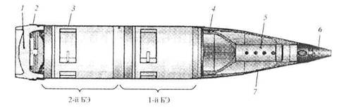 5 – вышибной заряд; 6 – неконтактный взрыватель; 7 – головной обтекатель.
