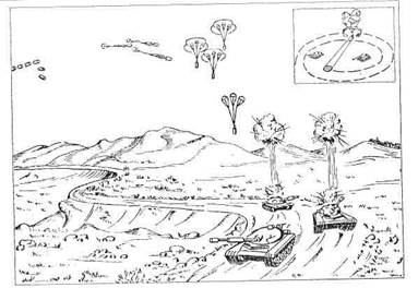 = 25...35° от вертикали, а сами элементы продолжают вращательное движение относительно оси подвеса парашюта с частотой n = 6...8 об/с. На высоте Н ~ 150...200 м КЦ приводится в боевое состояние. Угловое положение БЭ в пространстве и одновременное его вращение относительно оси подвеса обеспечивают КЦ сканирование по сходящейся спирали района местонахождения танков.