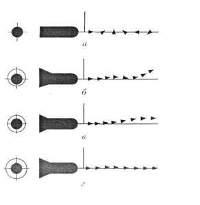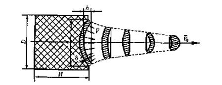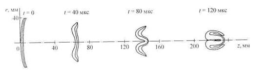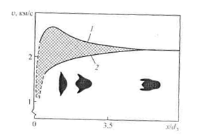 Слабовогнутая облицовка выворачивается вдоль оси, одновременно наблюдается уменьшение ее диаметра и натекание материала облицовки на ось [1]. В результате формируется центральный стержень, в котором выделяются головная (проявление эффекта «прямой» кумуляции - аналог классической КС) и хвостовая (проявление эффекта «обратной» кумуляции - аналог песта в классическом КЗ) части. При этом на начальных стадиях образования ПЭ осевая скорость головной части центрального стержня превышает скорость его хвостовой части, подобно тому, как для классического кумулятивного заряда скорость КС превышает скорость песта (рис. 7).