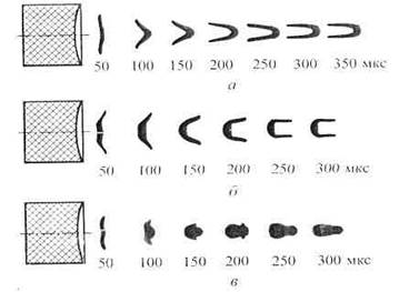 a) t=20 мкс; б) t =50 мкс; в) t = 120 мкс; б) t=50 мкс; в) t=120 мкс; 1-пластина;