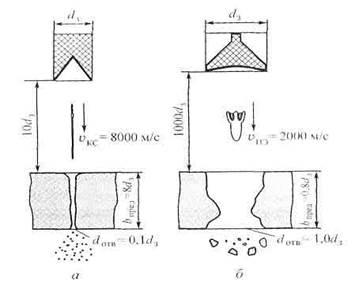 Эффективность ударного действия сформированных взрывом поражающих элементов определяется их массой и скоростью (для компактных ПЭ), а так же (для удлиненных ПЭ). Глубина бронепробития в преграде большой толщины (полубесконечная преграда) компактным ПЭ, движущимся со скоростью 2 км/с, на дальностях в несколько сотен калибров составляет L = (0,4...0,6)d3. При этом диаметр образуемого в преграде отверстия d0TB = (0,7...1,0)d3, что примерно в 5-6 раз превышает диаметр пробоины от кумулятивной струи классического КЗ. Взаимодействие компактных ПЭ с большими поперечными размерами и бронепреграды имеет, как бы, объемный характер в отличие от локального характера, присущего сильно удлиненным относительно тонким КС (в момент проникания в преграду dKC ~ 0,05d3) (рис. 13).