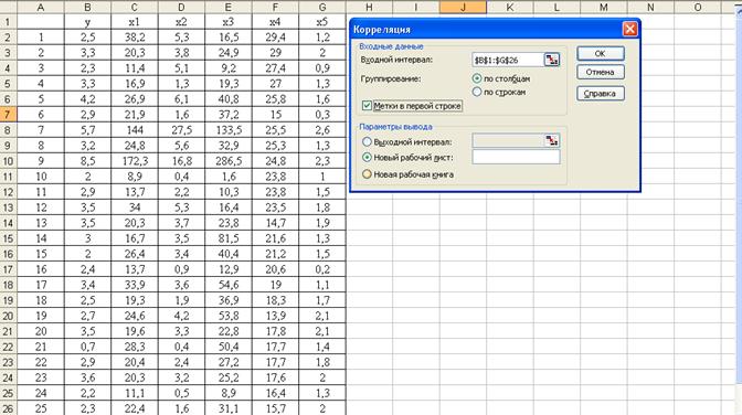 1) в главном меню последовательно выберите пункты Сервис / Анализ данных / Корреляция. Щелкните по кнопке ОК;