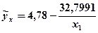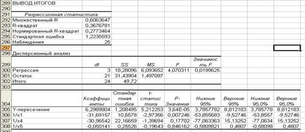 Оценивая параметры данного уравнения, замечаем, что статистически значимым является параметр при X1, (об этом свидетельствует величина р – значение из рисунка 4.8) следовательно, целесообразно строить уравнение гиперболической регрессии только с данным фактором. В результате получаем равнение следующего вида: