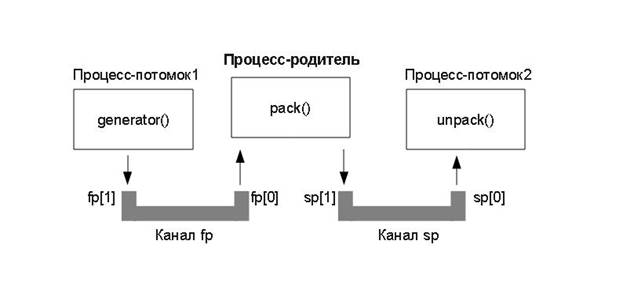 Процесс-генератор должен передавать данные и процессу-упаковщику через один программный канал. Процесс-упаковщик должен передавать данные процессу-распаковщику через другой программный канал.