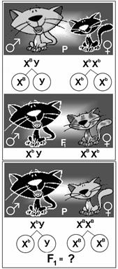 У кошек желтая окраска шерсти определяется доминантным геном В, а черная — b. Ген В сцеплен с Х-хромосомой. При скрещивании черной кошки с желтым котом все коты черные, а кошки с черепаховой окраской (трехцветные).